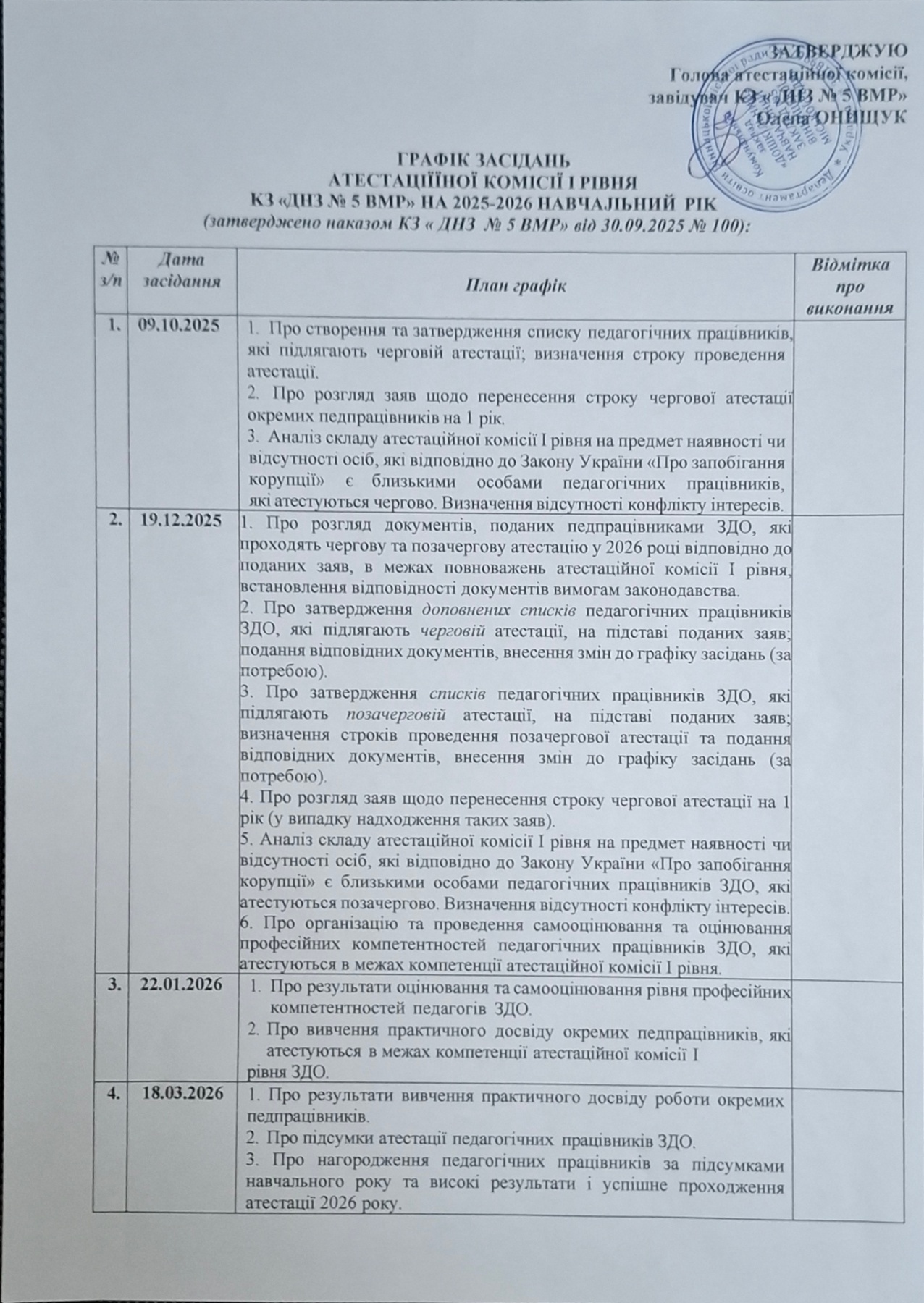 скласти і затвердити список педагогічних працівників, які підлягають черговій атестації в наступному календарному році, строки проведення їх атестації та графік проведення засідань атестаційної комісії;